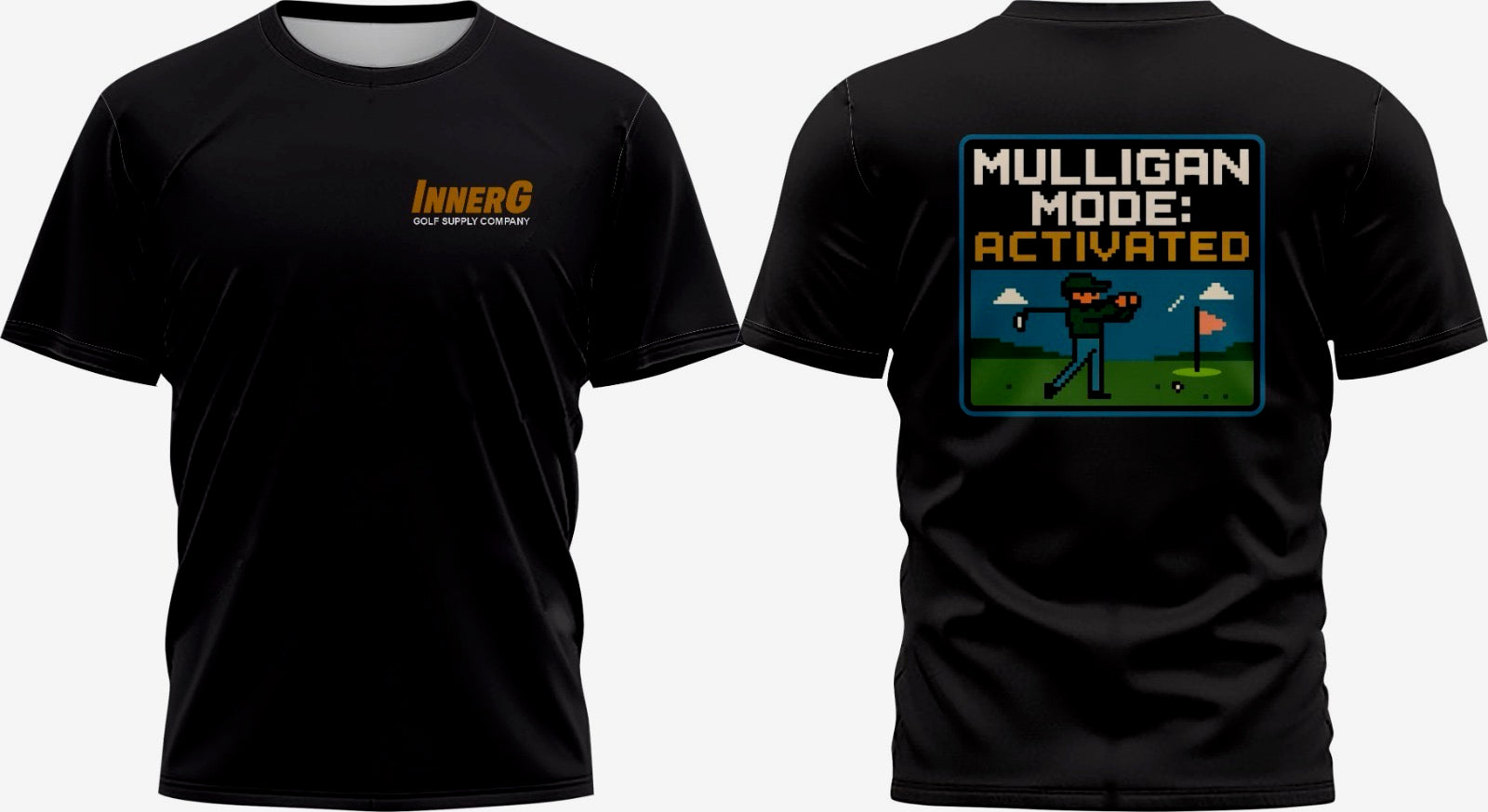 The Mulligan Mode Tee from InnerG Golf Supply is a graphic-driven nod to every golfer’s favorite reset button. Featuring a pixel-perfect 8-bit golfer mid-swing on the back and our signature InnerG logo stamped in gold on the chest, this black tee blends retro gaming vibes with on-course confidence.